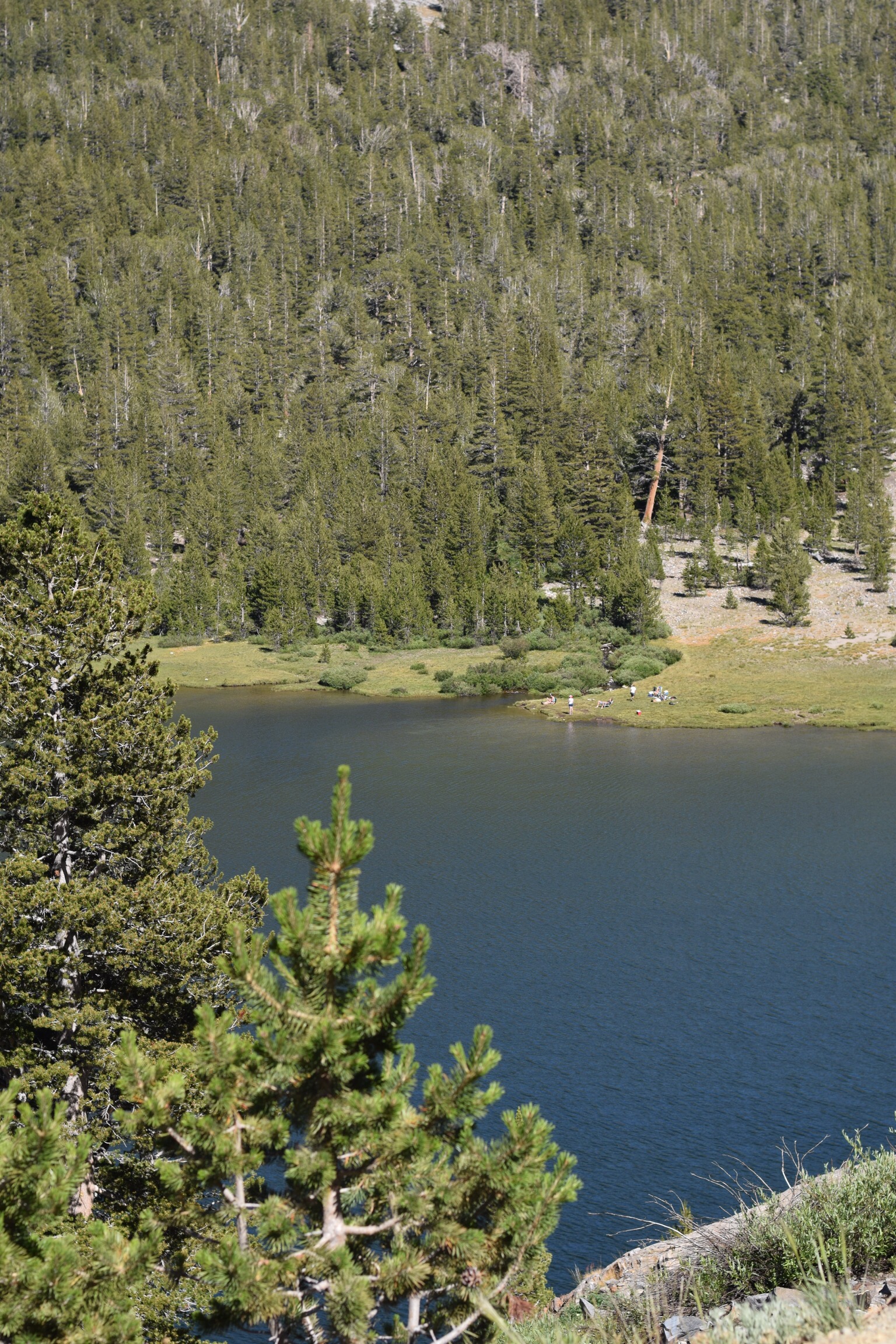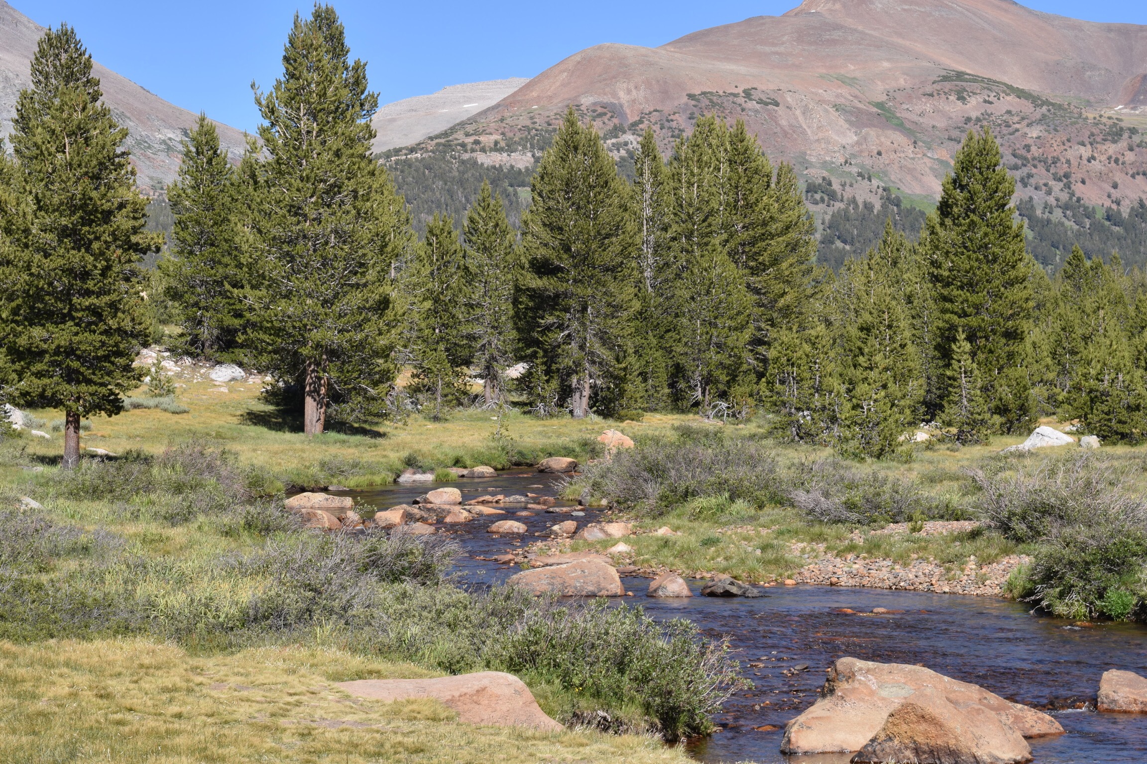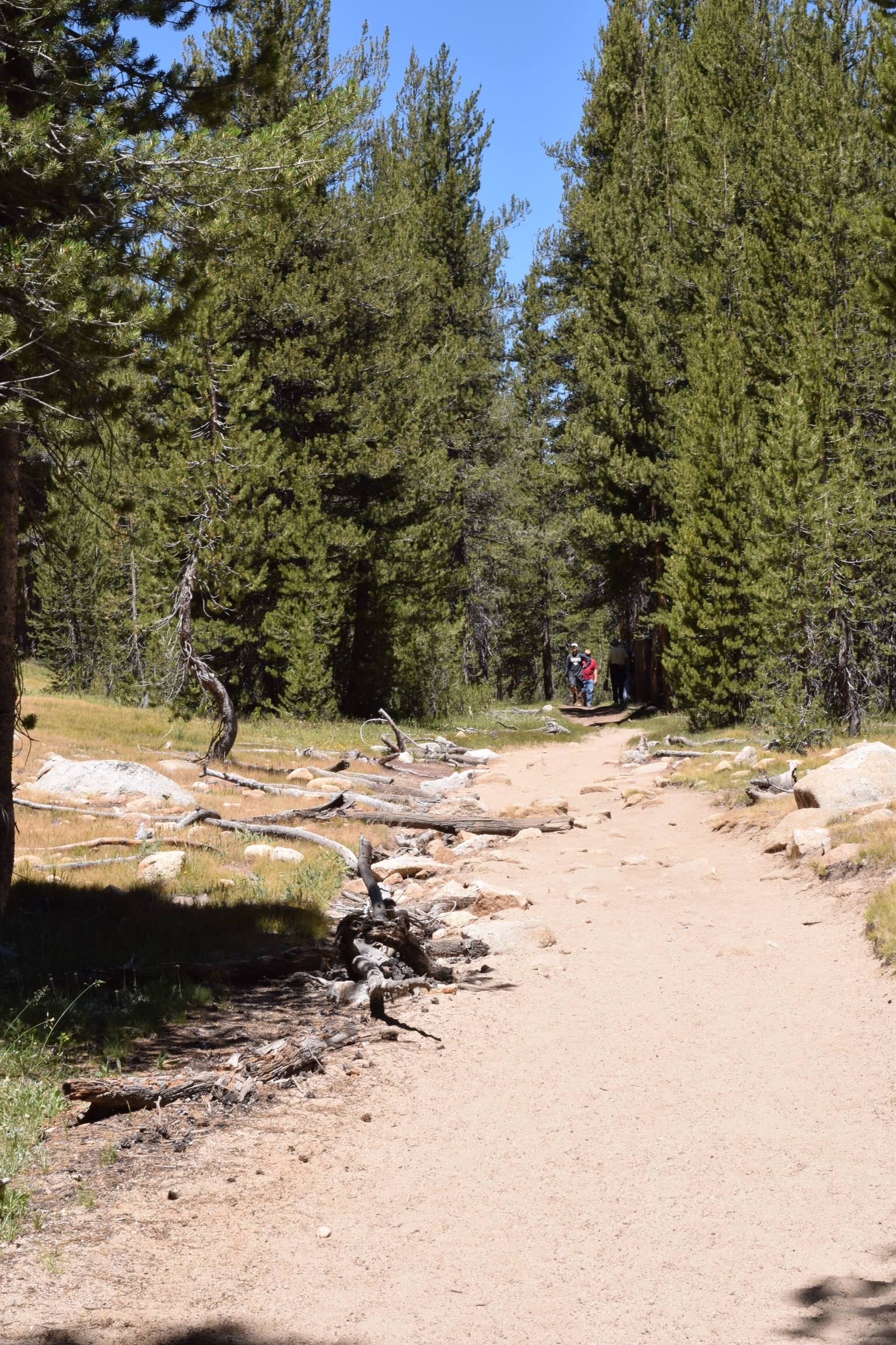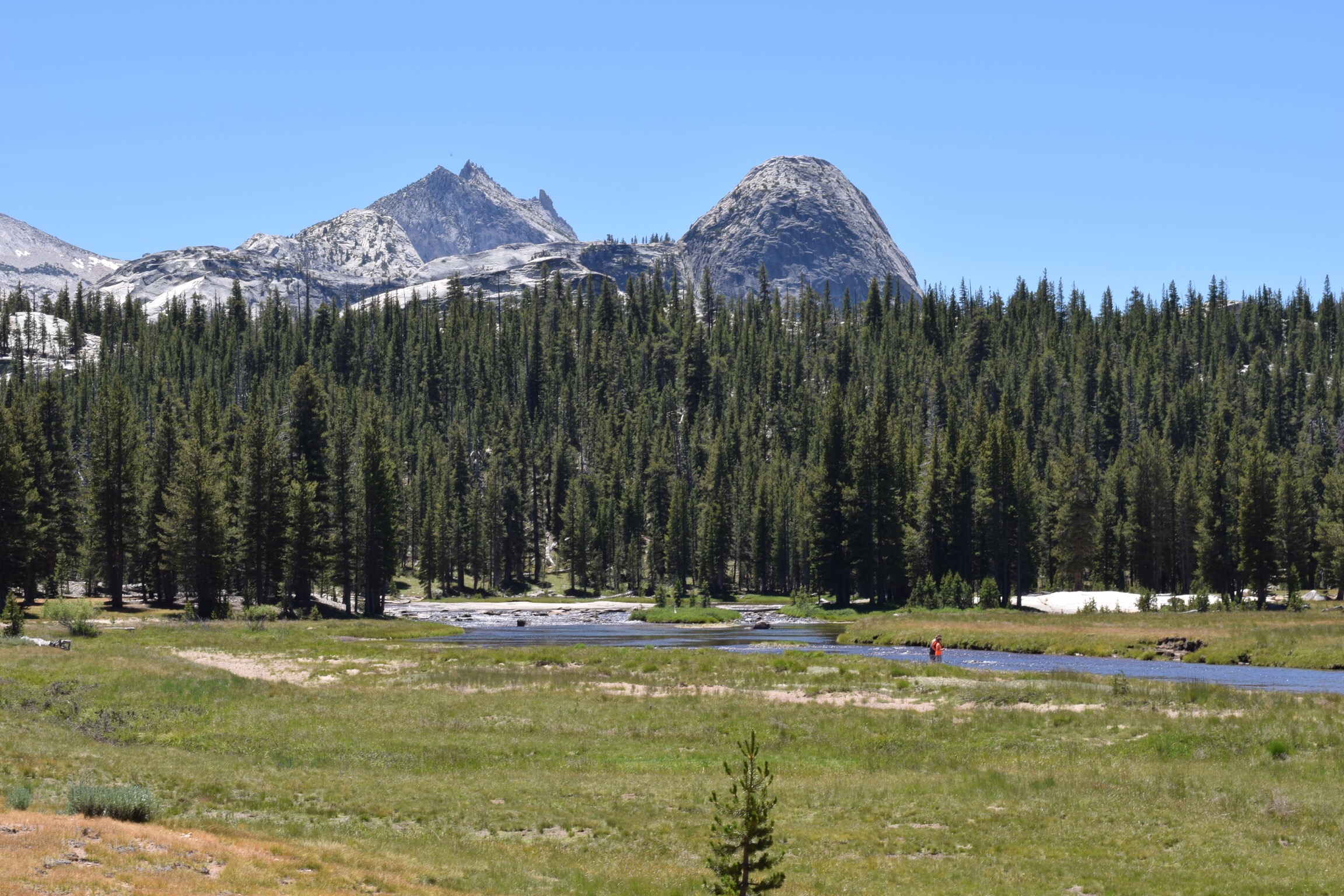 I set off and it was very, very hot. The trail was easy enough to find, showing evidence of many footsteps having been there before. After 10 minutes walking through a wild meadow, lush green in colour, flat in stark contrast to the mountains surrounding until you reach the Tuolumne River. (Un)fortunately, no bears in the vicinity. 🐻