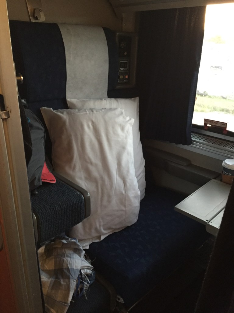My own little experience began slightly differently. A 4ft 11in girl carrying a 20 pound rucksack (I know as the conductor weighed it as he put it on the train) hustling, or at least trying to, while carrying a stuffed holdall and a shoulder bag. A conducter took pity on me and pointed me to the rear of the platform and I huffed and puffed till I got there, only to be placed in coach and not the sleeper I had booked. The female attendant hadn’t listened to me when I said where my seat was, which made me a little annoyed. Luckily, it was all remedied when the conductor came checking tickets and I was shown to my roomette, my home for the next 2 nights.